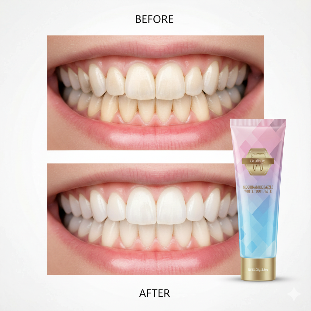 See the transformation with Oralhoe Nicotinamide Dazzle White Toothpaste.